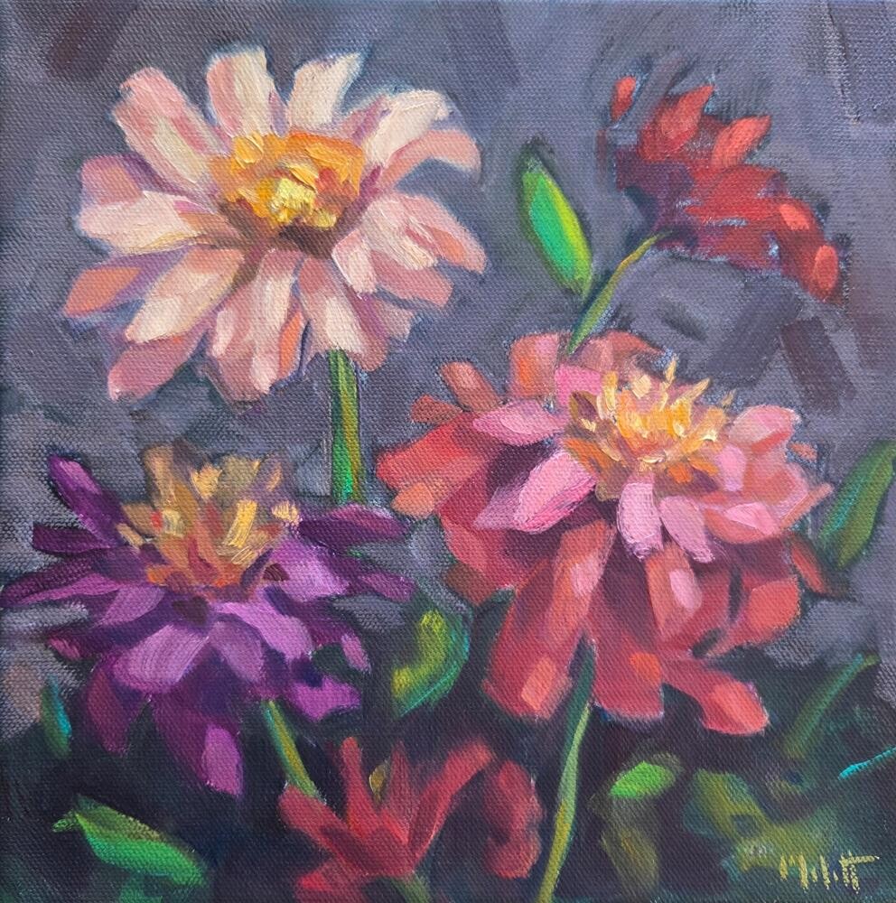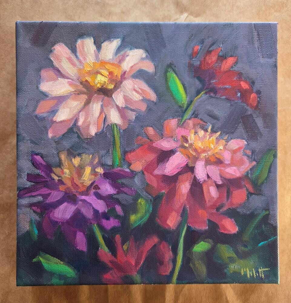 Zin Garden. Zinnias. 10x10 inch oil on gallery wrapped canvas. Zin Garden. Zinnias. 10x10 inch oil on gallery wrapped canvas. |