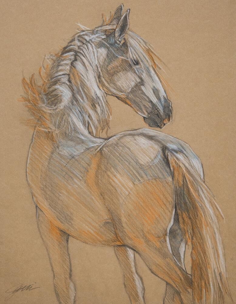 A graceful Palomino standing in the breeze just turned his head revealing his beautiful profile showcasing its flowing mane and strong physique. The use of graphite, soft watercolor pencils and the sketchy lines create a sense of movement and elegance. A graceful Palomino standing in the breeze just turned his head revealing his beautiful profile showcasing its flowing mane and strong physique. The use of graphite, soft watercolor pencils and the sketchy lines create a sense of movement and elegance. |