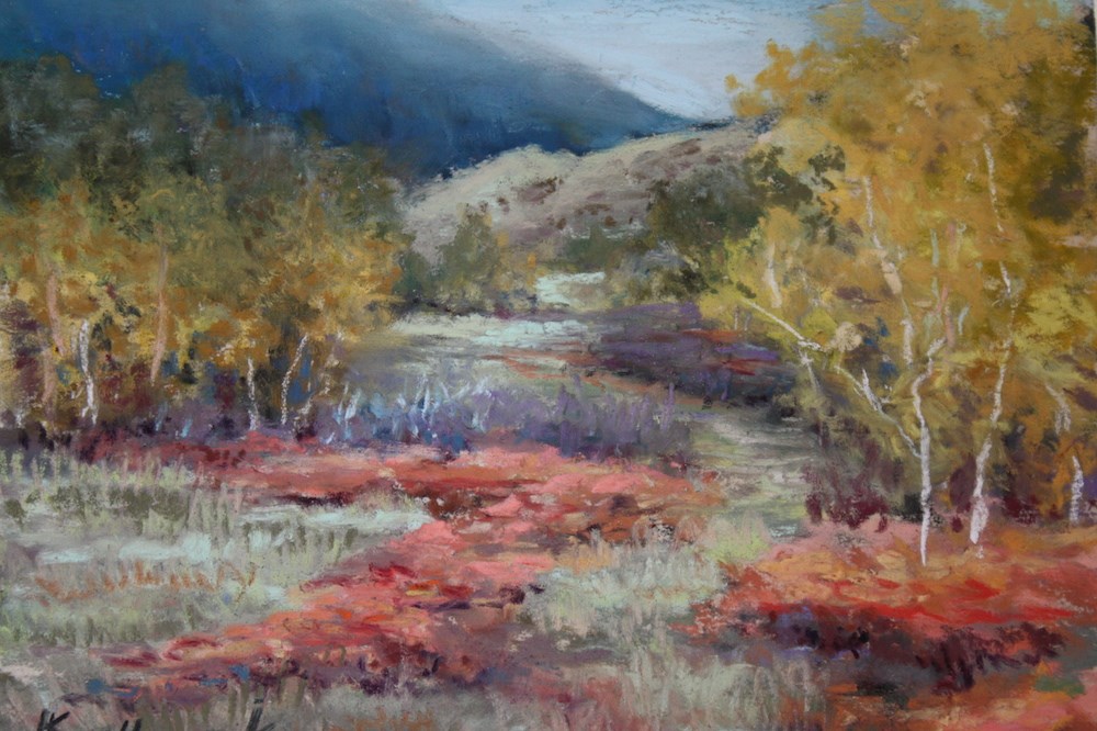 The October morning I painted this was cold and rainy. I had to hide my easel and pastels under a piece of plastic so the pastels wouldn't melt. But the colors were intense and very appealing!