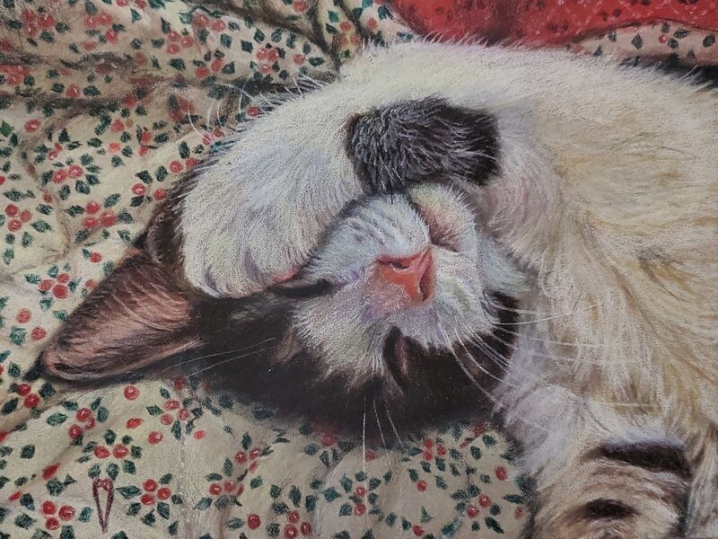 This little kitty reminded of Sarah, a very sweet kitty that we lost to cancer a few years ago. This was done in colored pencil with a pastel underlayer for the background on pastelmat. It is 6x8 inches. This little kitty reminded of Sarah, a very sweet kitty that we lost to cancer a few years ago. This was done in colored pencil with a pastel underlayer for the background on pastelmat. It is 6x8 inches. |