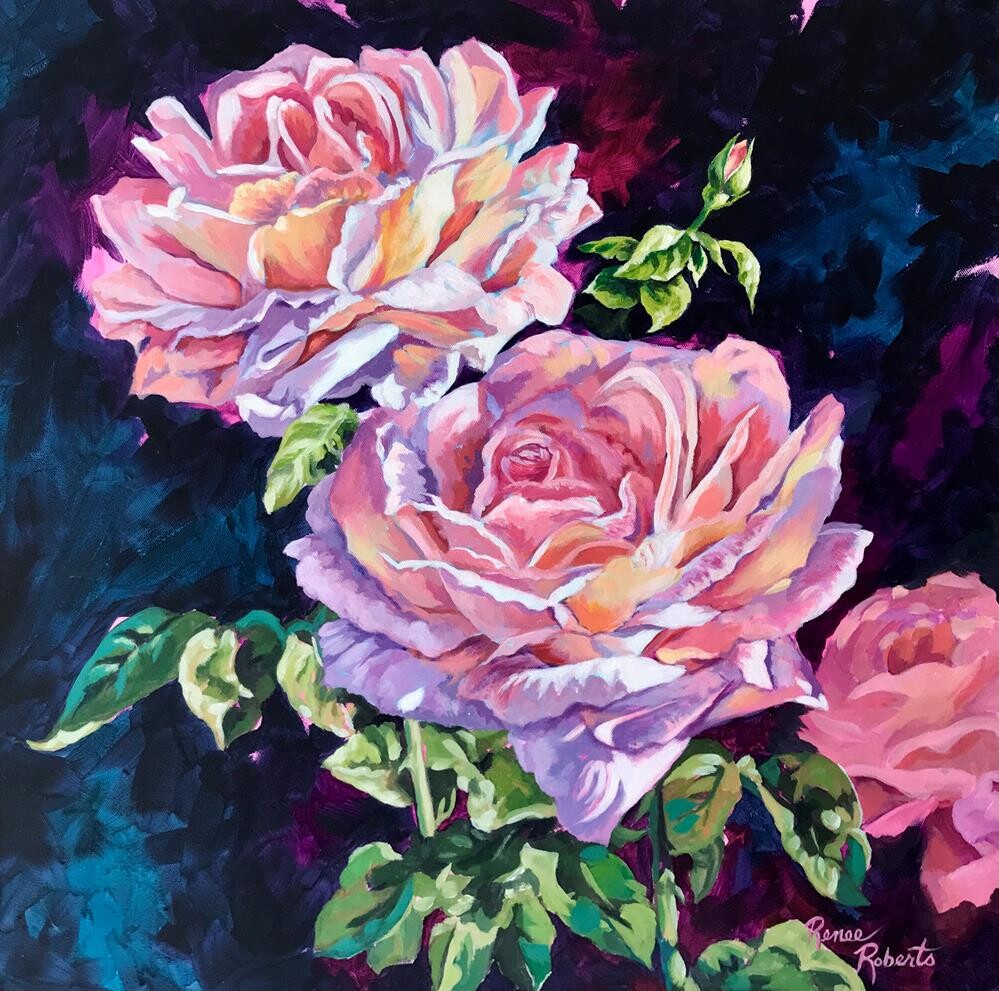 Light filled pink roses on a dark background with tones of magenta, blue and purple scattered throughout. Light filled pink roses on a dark background with tones of magenta, blue and purple scattered throughout. |